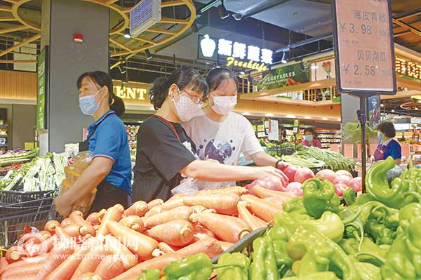 7月3日,市民在華夏超市選購商品。近期,宿城各大超市米面油、蔬菜、水果、肉類等生活必需品供應充足、品種豐富、價格穩定,可滿足市民日常需求。 記者 王明輝 攝