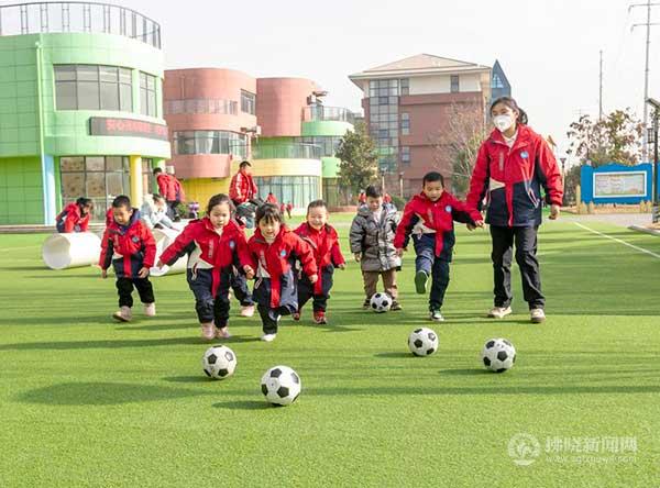2月13日,在泗縣經濟開發區中心幼兒園內,孩子們正在操場鍛煉。