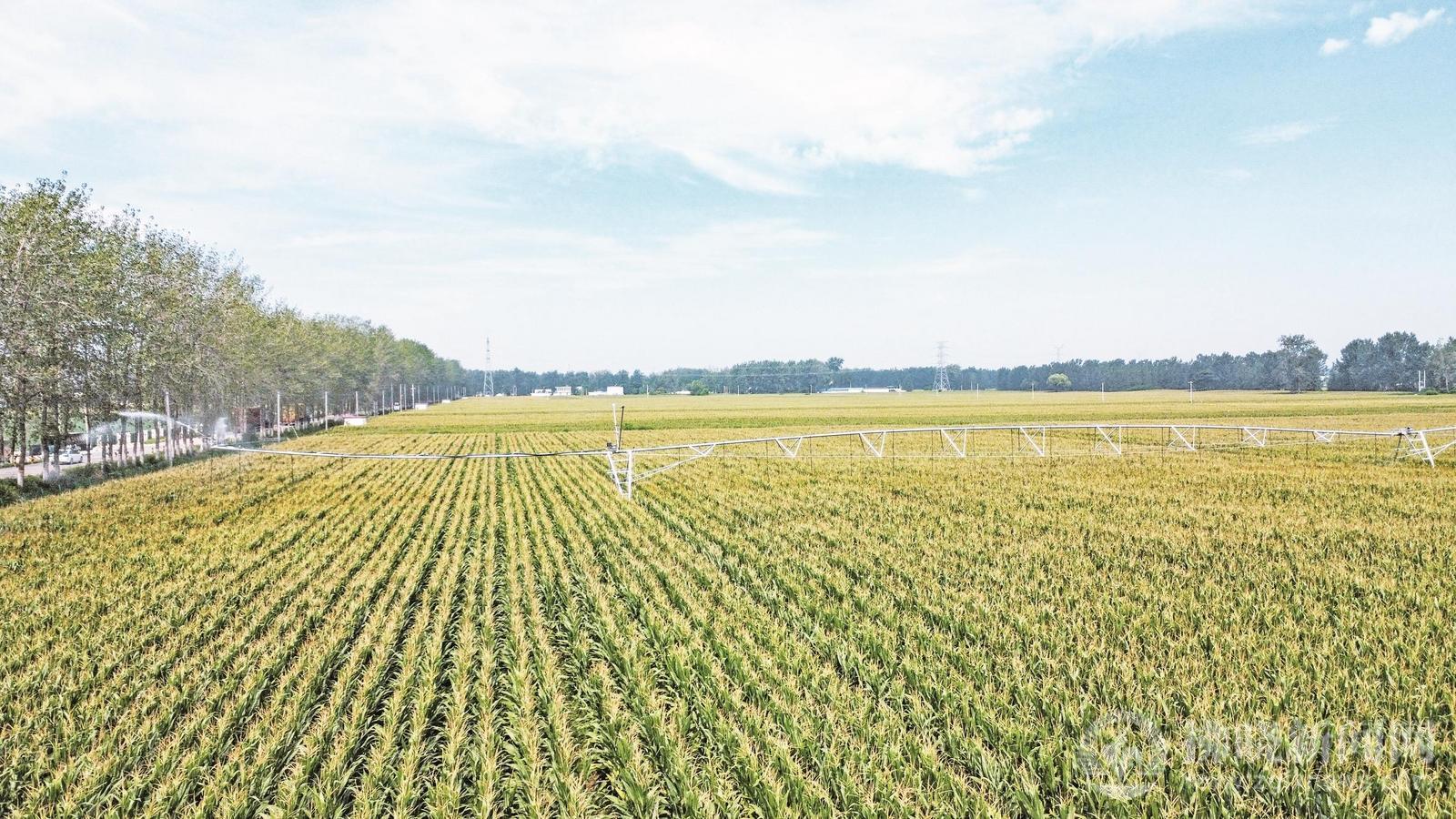 8月21日,航拍黃淮海(宿州)種業科技谷高產玉米栽培示范田智能化節水設備灌溉作業現場。