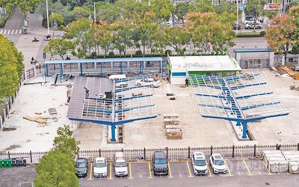 10月19日,航拍正在施工中的宿城迎賓大道和淮海路交叉口東北角新能源汽車充電停車場(chǎng)。今年以來,我市通過盤活城區(qū)邊角地塊新建停車場(chǎng)、增加新能源停車泊位等舉措擴(kuò)容增量,有效緩解市民“停車難,充電煩”的困擾。目前,全市新增公共停車泊位近2800個(gè),城市停車泊位達(dá)3.1萬余個(gè)。