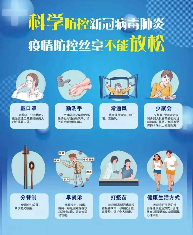保持良好的個人防護意識,日常科學佩戴口罩、勤洗手、常通風、不聚集、少聚餐、保持安全社交距離、注意咳嗽禮儀、使用公筷公勺。