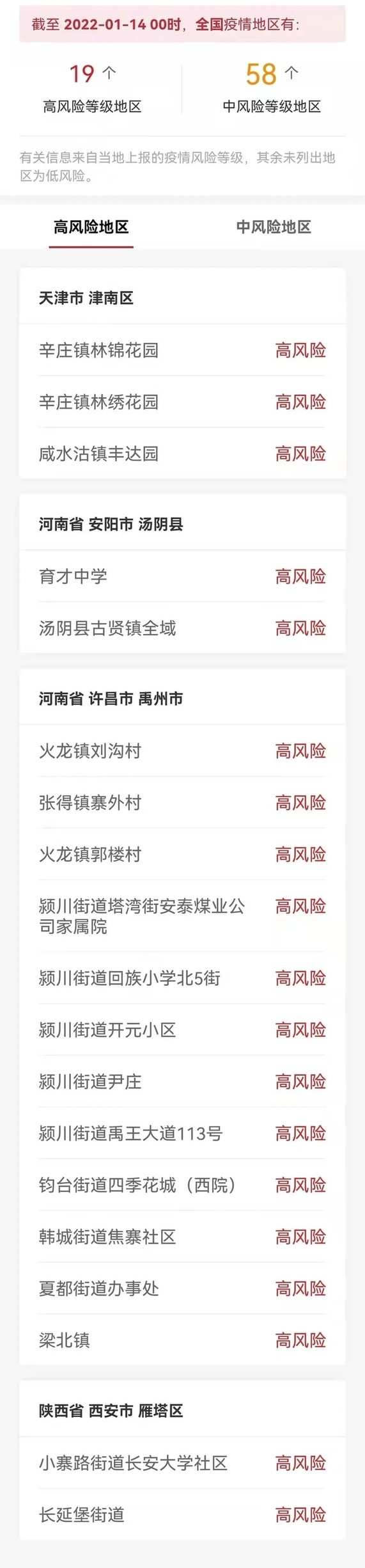 截止2022年1月14日0時:全國共有高風險地區19個,其中陜西省西安市2個;河南省許昌市禹州市12個,安陽2個;天津市3個。中風險地區58個,其中陜西省西安市23個;浙江省寧波市2個,金華市2個;河南省洛陽市2個,許昌市禹州市1個,鄭州市13個,安陽市5個;廣東省深圳市4個;天津市5個;上海市1個。具體如下: