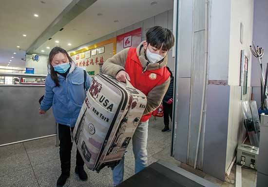 “請這邊走!”1月17日上午,快客站入口處,大學(xué)生志愿者趙樂樂和喬鑫磊身著志愿者馬甲,微笑著引導(dǎo)進(jìn)站乘客掃描行程碼、安康碼,并為大家運(yùn)送行李。