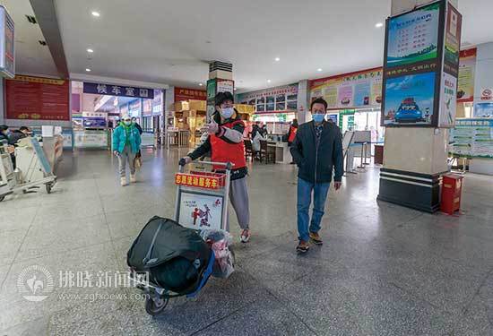 志愿者在市快客站熱情為旅客運(yùn)送行李。