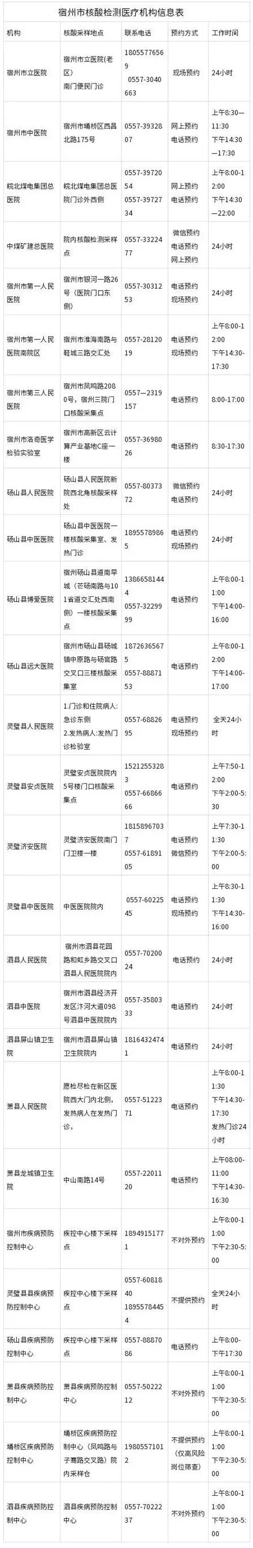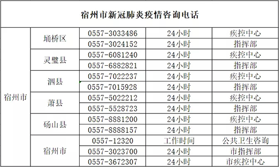 附:宿州市核酸檢測醫療機構信息表及宿州市新冠肺炎疫情咨詢電話