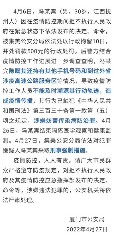 今年3月26日,犯罪嫌疑人馮某賓從有本土病例的江西省撫州市返回廈門市后,拒絕執(zhí)行廈門市應(yīng)對新冠肺炎疫情工作指揮部〔2022〕第2號(hào)通告的預(yù)防、控制措施,未第一時(shí)間向社區(qū)報(bào)備、未立即進(jìn)行核酸檢測,且在出現(xiàn)發(fā)熱等不適癥狀后仍多次出入公共場所。4月2日,馮某賓被確診為新冠肺炎確診病例,與其密接600余人、次密接600余人被隔離管控。