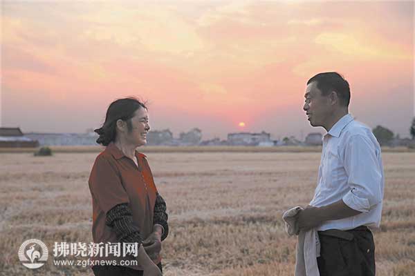 夕陽下,韓大朋夫婦面對豐收場景掩飾不住內心的喜悅。