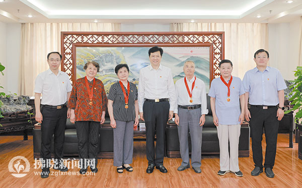 6月28日上午,市委書記楊軍等領導為4名老黨員頒發“光榮在黨50年”紀念章并合影。記者 董虎 攝