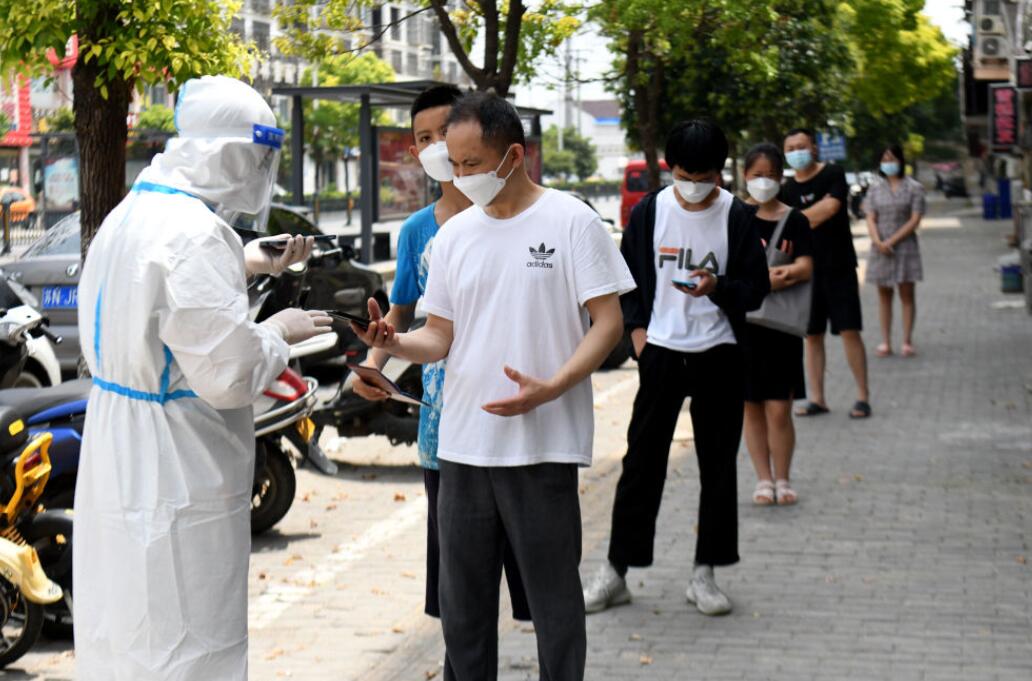 7月3日,在安徽省宿州市泗縣虹城街道一小區,居民排隊等候接受核酸采樣。新華社記者 黃博涵 攝
