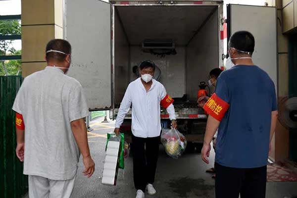 7月4日,安徽泗縣玉蘭小區(qū)的工作人員接收居民的訂單物資。新華社記者 黃博涵 攝