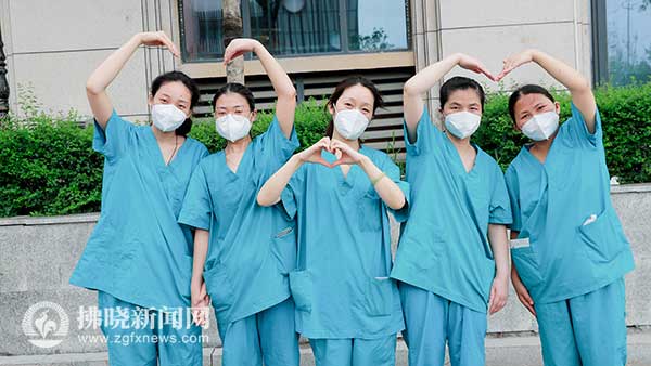 脫去“戰袍”的“大白”們在互相加油鼓勁