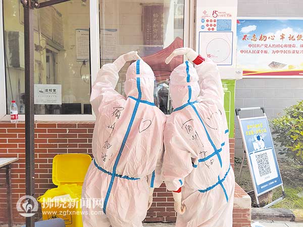 六安市霍山縣支援埇橋區醫療隊隊員夏云和蘇丹在抗疫間隙為宿州加油。 記者 劉春艷 付雪芹 攝