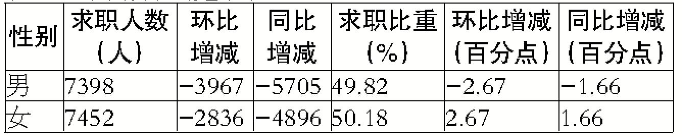 從求職人員的性別來看,隨著各項就業政策和創業扶持政策逐步完善,婦女就業渠道不斷拓寬,我市女性求職人數首次超過男性,比男性多54人,求職比重環比、同比分別上升2.67和1.66個百分點(見下表)。