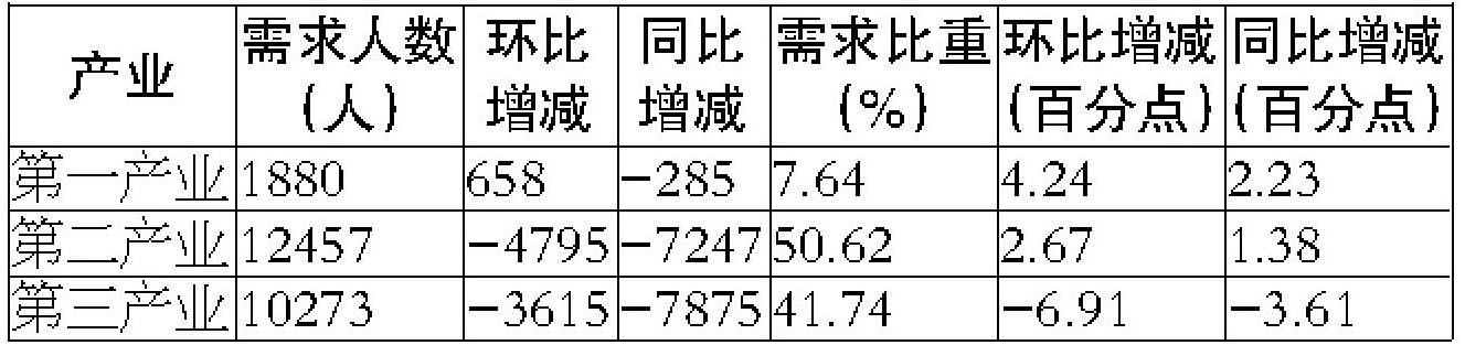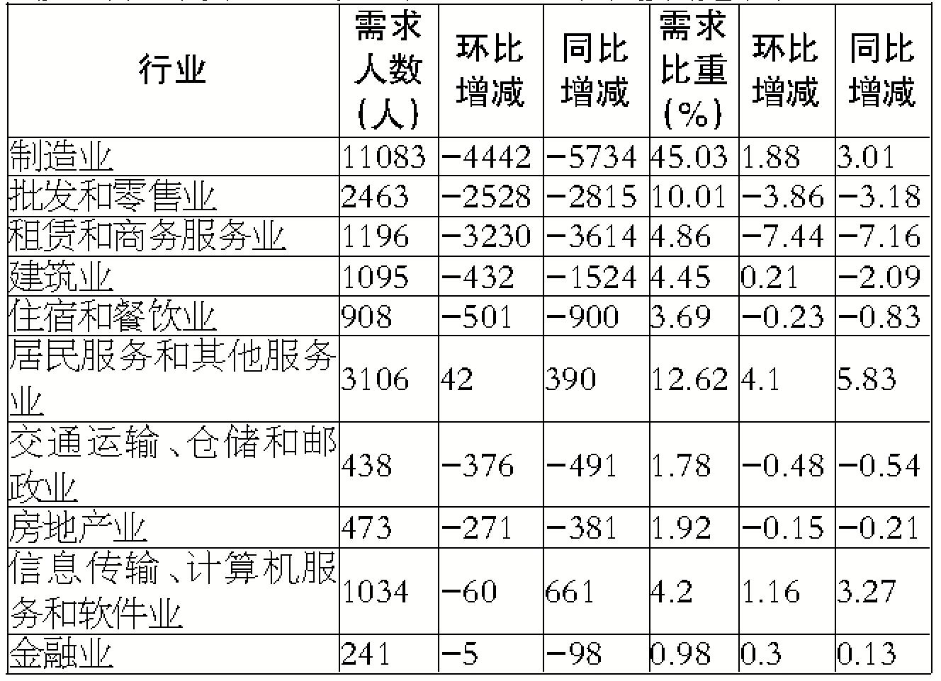 2、主要行業需求情況,十個重點監測行業需求22037人,占總需求的89.54%,環比、同比分別下降4.51和1.77個百分點。制造業、居民服務和其他服務業、信息傳輸/計算機和軟件業及金融業需求比重環比、同比呈“雙升”走勢(見下表)。