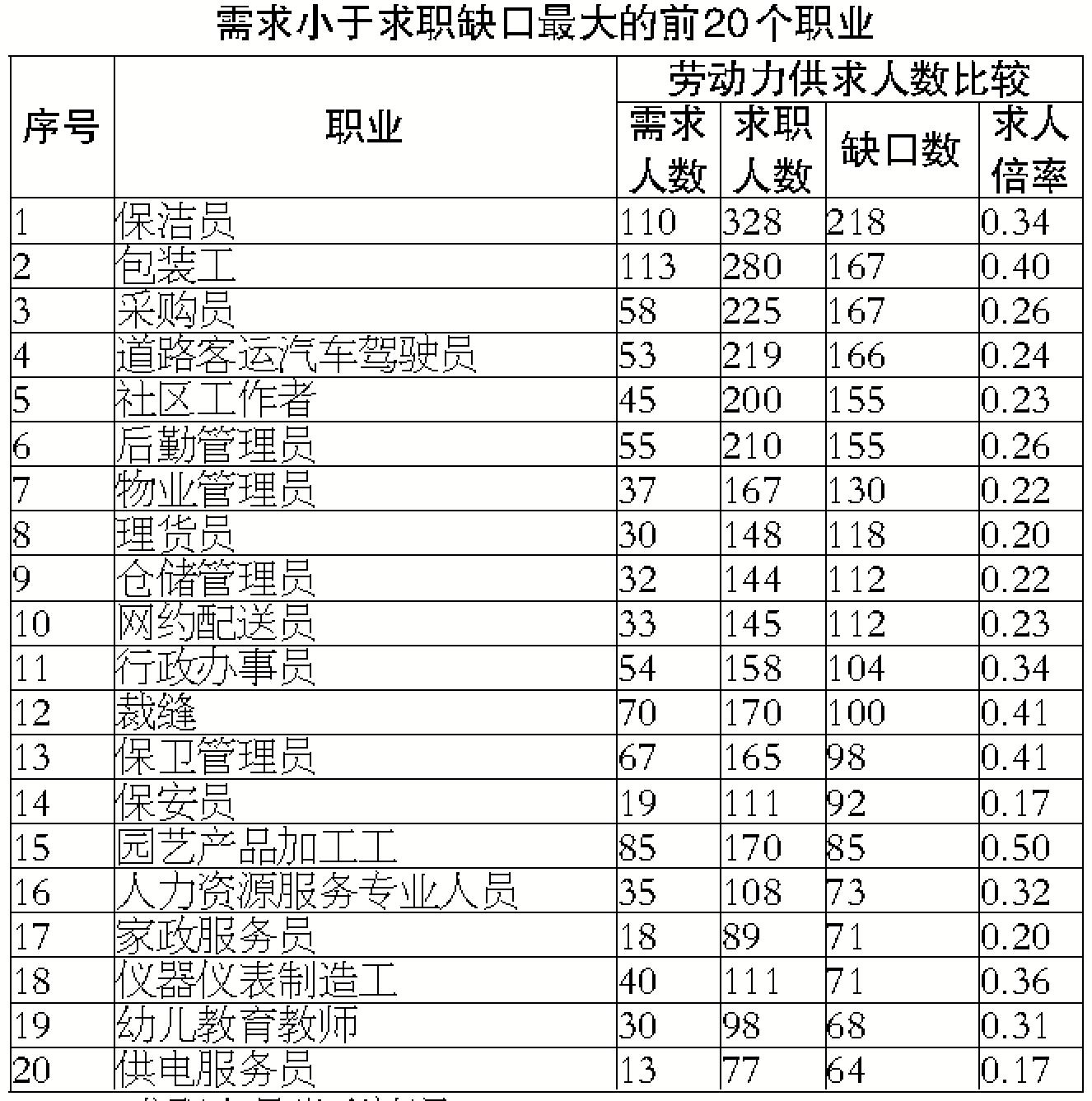(2)本期市場求職大于需求缺口較大的職業37個,用工缺口為2861人。其中缺口最大的前20個職業見下表。