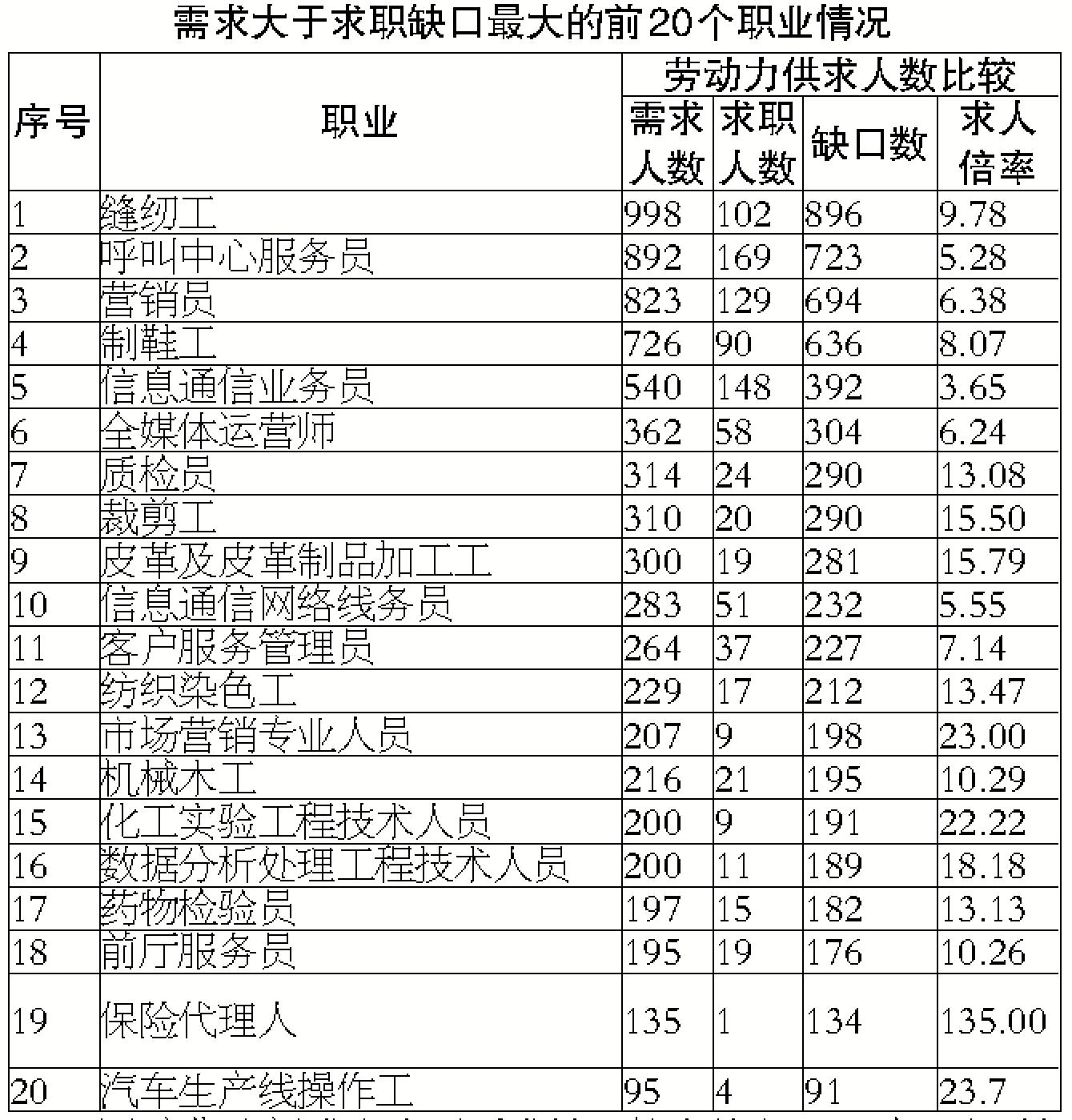 (1)本期需求大于求職缺口較大的職業53個,用工缺口為7759人,主要以制造類、銷售類和通信類人員為主。其中缺口最大的前20個職業見下表。