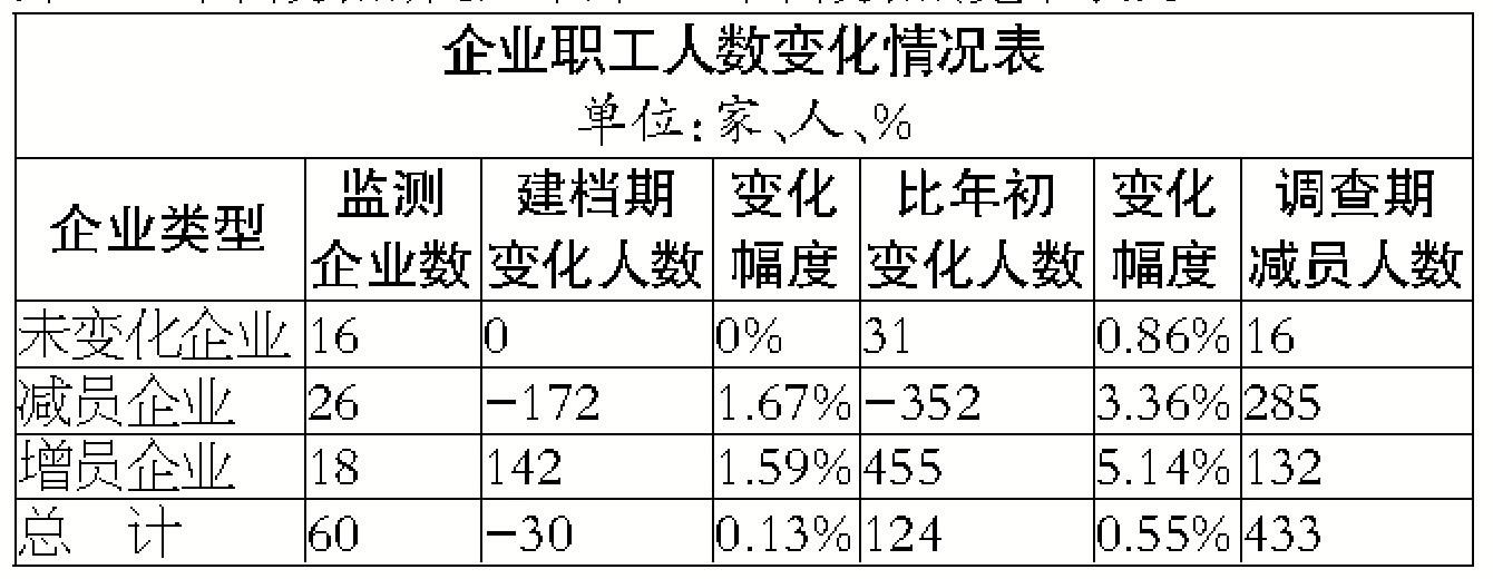 本季度末,60家監測企業在崗職工22846人,比上月末減少30人,減幅為0.13%。其中,增員企業18家,占監測企業數的30%,環比下降13.33個百分點,同比上升3.33個百分點;增員142人,增幅0.62%,環比下降0.56個百分點,同比上升0.29個百分點;減員企業26家,占監測企業數的43.33%,環比、同比分別上升6.66和3.33個百分點;減員172人,減幅0.75%,環比上升0.31個百分點,同比下降0.6個百分點(見下表)。
