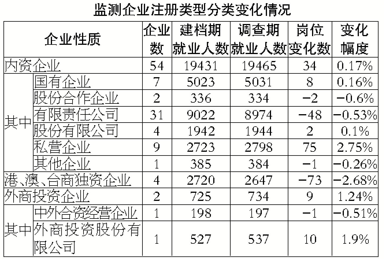 在60戶監測企業中,共有54家內資企業監測崗位數19465人, 比上月末增加34人,增幅0.17%;2家外商投資企業監測崗位數734人, 比上月末增加9人,增幅1.24%;4家港、澳、臺商獨資企業監測崗位數2647人,比上月末減少73人,減幅2.68%(見下表)。