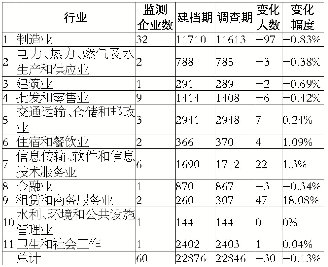從行業分類來看,減員人數最多的前5個行業分別是:制造業減員97人,批發和零售業減員6人,電力/熱力/燃氣及水生產和供應業減員3人,金融業減員3人,建筑業減員2人;減員幅度最大的前5個行業分別是:制造業減員0.83%,建筑業減員0.69%,批發和零售業減員0.42%,電力/熱力/燃氣及水生產和供應業減員0.38%,金融業減員0.43%(見下表)。