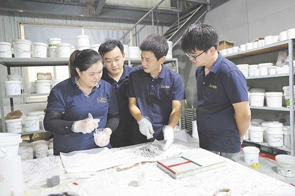 汝宗林長(zhǎng)期致力于金磨石地坪施工工藝的研究。作為一種新型綠色建筑材料,金磨石不再局限于以傳統(tǒng)的水泥黃沙為主要材料,更多地開發(fā)利用建筑垃圾、礦山尾料、廢舊玻璃、陶瓷、瓦片等作為原材料,擴(kuò)大了這些材料的應(yīng)用范圍和性能,解決了地面缺陷帶來的難度。汝宗林研發(fā)的金磨石系統(tǒng)無溶劑底涂材料、抗裂抑制膜、環(huán)氧玻璃鋼樹脂,很好地解決了由于地面開裂而導(dǎo)致的面層金磨石開裂問題,經(jīng)過這一點(diǎn)一滴的改進(jìn)和完善,產(chǎn)品的質(zhì)量、種類、花色都得到了極大的提升和豐富。