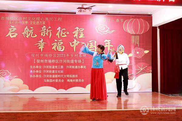 埇橋區汴河街道辦事處群眾自導自演的“啟航新征程 幸福中國年”鄉村春晚現場,戲曲表演備受歡迎。 特約攝影 丁輝