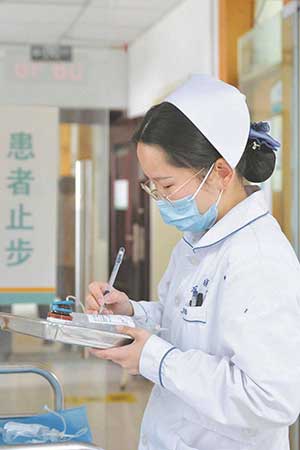 護(hù)士劉夢(mèng)雅準(zhǔn)備為患者輸液。