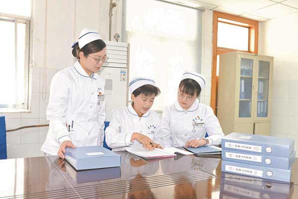護(hù)士長劉湘云(中)對(duì)副護(hù)士長肖娜(左)、魏紫薇(右)日常工作進(jìn)行督查指導(dǎo)。