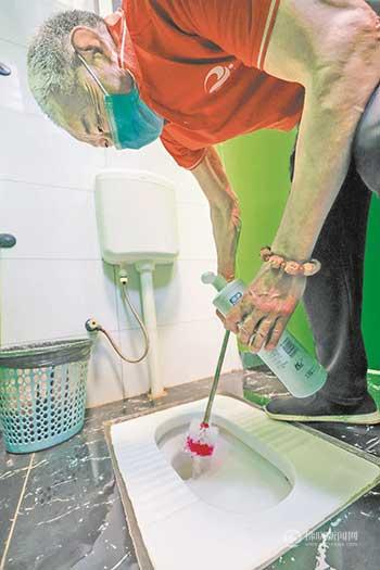 歐成艾在擦洗便池。