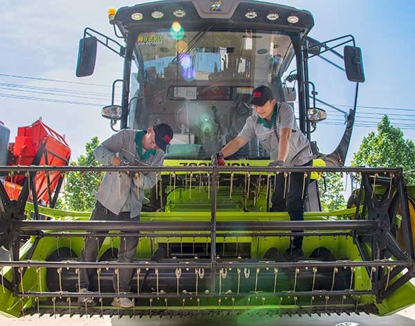 碭山縣農機發展服務中心組織技術人員檢修、調試農業機械,為即將到來的“三夏”做準備。 特約攝影 崔猛