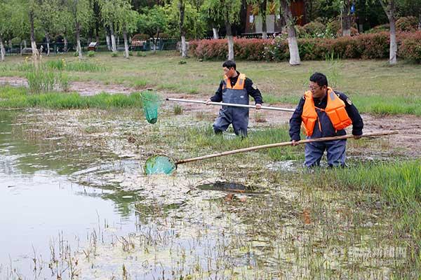 對于這樣一群“馬夾哥”,市民都熟悉他們的標配:騎著電動車,后座豎著一個長長的撈罩,急匆匆地奔向三角洲公園水域。他叫楊京滬,在此等候的還有一個小伙子叫郭良會。每天他們所要做的工作就是保證湖面的清潔。幾個年頭下來,經常來此晨練的市民都親切地稱他們為“撈草哥”。