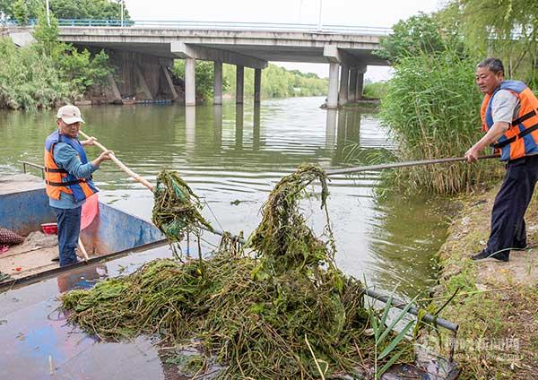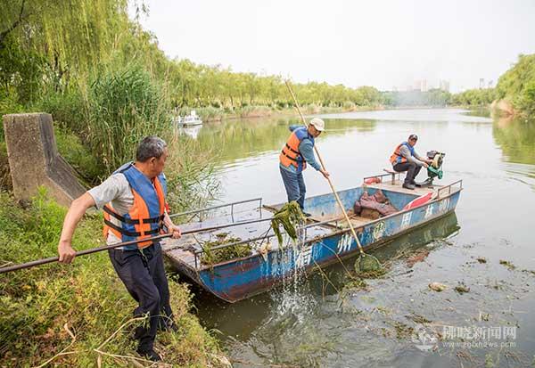 河道清理工在宿州大道南側的新北沱河段水域清理雜草等水面漂浮物。