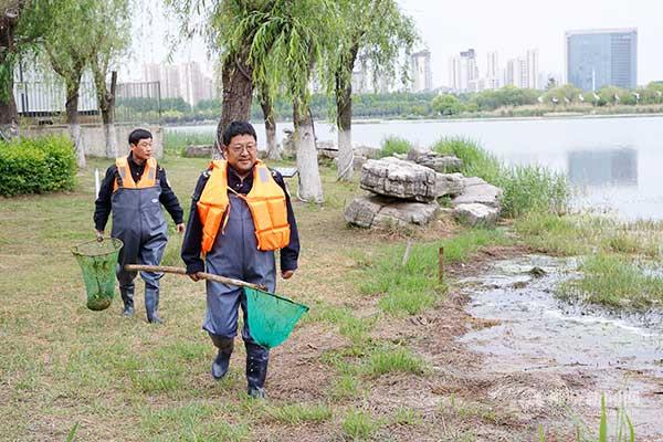 清晨6點,兩人就到達地點,麻利地穿上皮衩,帶著撈罩下湖打撈水面垃圾、綠苔及雜草等漂浮物。他們從三角洲公園南長廊沿湖堤一直行至西北土山,然后進入湖中3個島區,環島入水打撈垃圾雜草等水上漂浮物。環湖堤長達6公里以上,每天站在1米多深的水中,一干就是三四個小時。
