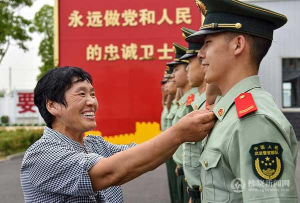 給武警戰士整理衣裝。