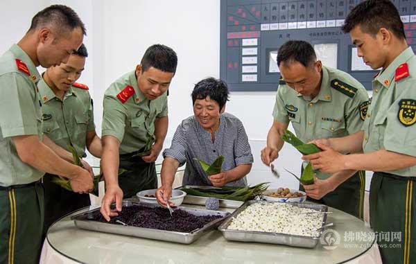 教戰士們包粽子。