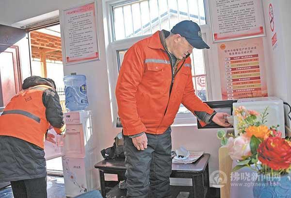 在環城北路愛心驛站,環衛工人在接熱水、熱飯。