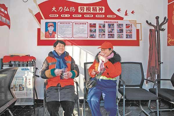工作間隙,環衛工人喝著熱水,享受驛站里的溫暖時光。