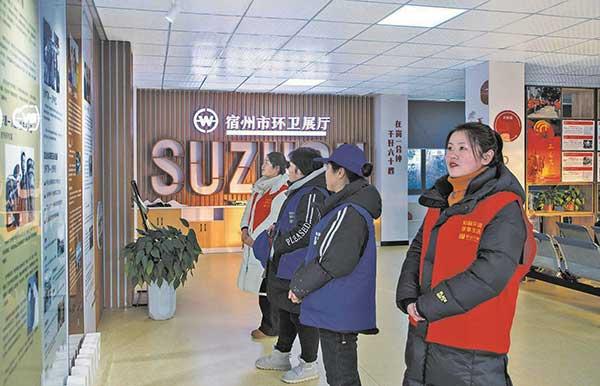 在汴北愛心驛站,管理員帶領環衛工人觀看環衛發展史。