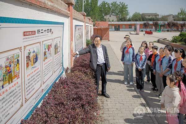 閔賢小學校園內,老師在給低年級學生及幼兒園小朋友講解文化墻上的“新二十四孝”。