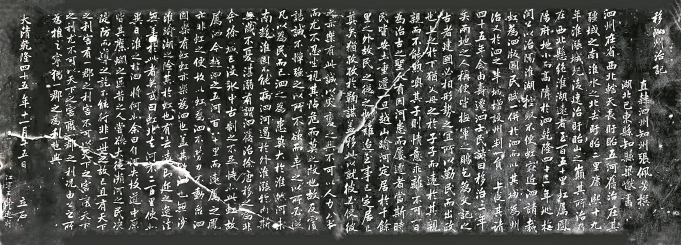 《移泗州治記》碑于清乾隆四十五年(1780年)刻。碑文由清朝直隸泗州知州張佩芳撰,清代著名書法家、湖北巴東縣知縣梁巘書。碑文不僅記載了安徽巡撫閔鄂元上疏奏請裁虹并泗、泗州移虹前后的歷史事件,還具有很高的書法藝術欣賞和研究價值。
