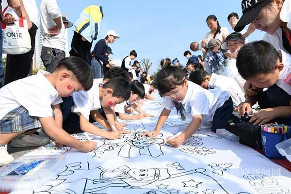 筆下有畫,心中有國。活動現(xiàn)場,孩子們蹲在百米長的畫布前埋頭作畫,神情專注而認真。他們放飛想象力和創(chuàng)造力,用水彩、水粉等,在長長的畫布上揮灑著美麗的色彩,用生動率真的畫筆描繪著祖國的大好河山、家鄉(xiāng)的日新月異和生活的幸福美好。