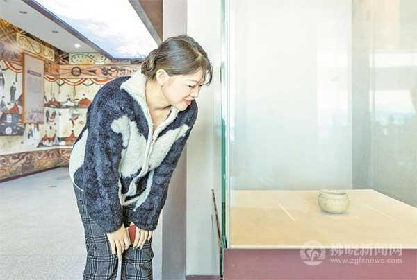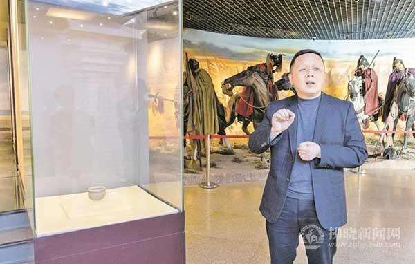 靈璧縣文旅局副局長張少華為游客講解乳釘紋刻花瓷缽。