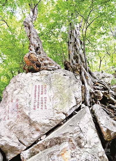 石破天驚:位于瑞云寺上方。這株青檀仿佛從巨石之中長出,在其漫長的生長過程中,具有頑強生命力的樹根將巨大的巖石脹裂,樹干從脹裂的石縫中長出,故稱“石破天驚”。
