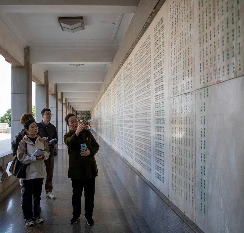 本報(bào)記者在烈士墻前聽講解員魏天梅講述烈士子女尋親的故事。記者 蔣幫煜 攝