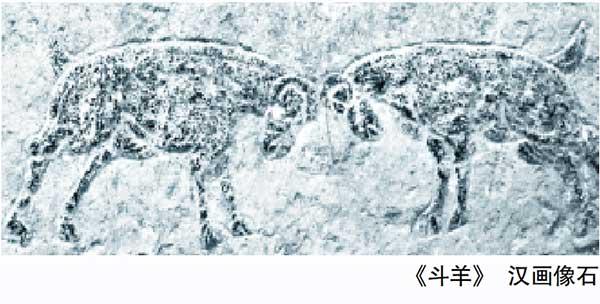 蕭縣博物館藏漢畫像石《斗牛圖》充滿動感。前面斗牛者,手持鐵錘,伺機敲擊牛頭;后面一人,想是助手,手攥尖刀,準備給牛放血,顯然斗牛者失手,沒有擊中要害,僅僅把牛角的角殼敲掉,而被擊打的牛受疼狂跳,騰躍竄逃。整個畫面線條流暢,動感強烈,可與西班牙斗牛相媲美!斗羊,漢畫像石《漢代斗羊圖》中畫有兩只雄壯的公羊相撞的瞬間,仿佛傳來巨大的轟鳴。今天的蕭縣、碭山及蘇魯豫皖交界處,仍然傳承著斗羊和斗雞、斗牛的民俗。