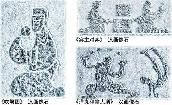 蕭縣圣村出土的一塊漢畫像石《樂舞百戲圖》,完整記錄了漢代一次樂舞百戲表演的場面。畫面好像一幅特寫,干凈利索定格了演職人員:石上共刻八人,左一吹排簫;左二吹篪(笛);左三吹竽;畫面中間刻建鼓舞,鼓上有華蓋,兩側有羽葆,建鼓下有羊形鼓跗;兩側各一人,執桴(鼓槌),跨步擊鼓;建鼓舞右側為一人著短衣跳丸;再右一人倒立,居右端者左向跽坐,手持一圓形物為塤。蕭縣破閣村和東黃莊漢墓出土的畫像石《撫琴歌舞圖》,則刻畫了撫琴鼓瑟的歌舞圖式。