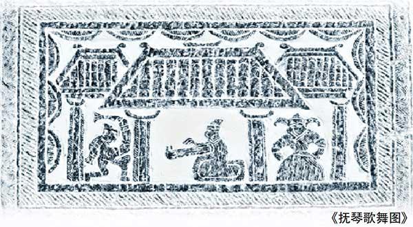 漢代的彈弦樂器有琴、瑟。蕭縣破閣村出土的一塊漢畫像石《撫琴歌舞圖》,畫面分上、中、下三格,上格左側一人,頂梳圓髻,袖手正面而坐,右側一人,似戴冠,面左跪拜;中間,墓室主人端坐廳堂,正在欣賞舞蹈表演;下格為二人樂舞,居左者長袖飄飄,身姿婀娜,居右者撫琴鼓瑟。