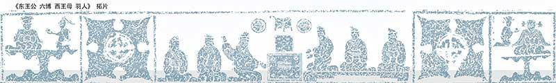 在蕭縣圣村出土的漢畫像石《東王公 六博 西王母 羽人》,畫面分五欄,左端一欄左上部為東王公,其右一羽人,面左跪呈一方形物似為仙藥。中欄為六博圖像,共六人,皆戴進賢冠,跽坐,左三與左四二人六博,其中間上部可見一樽,兩側置盤及耳杯,下為六博盤,再下為一案,案上可見算疇,畫面表現主賓對弈,余者觀戰,賓主正襟危坐,聚精會神。右端欄內為西王母,其左一人為侍者,梳圓髻垂梢,右向跪呈一物,似為仙藥。漢代人相信,死后靈魂會被接引到西方極樂世界,從而繼續享受世間的繁華富貴,在仙界也是一番歌舞升平、六博對弈的美好生活。