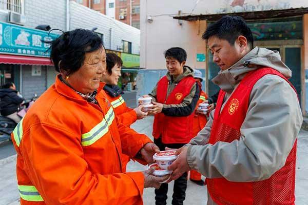 埇橋區(qū)南關(guān)街道九中社區(qū)工作人員給環(huán)衛(wèi)工人送臘八粥。 記者 董木子 攝