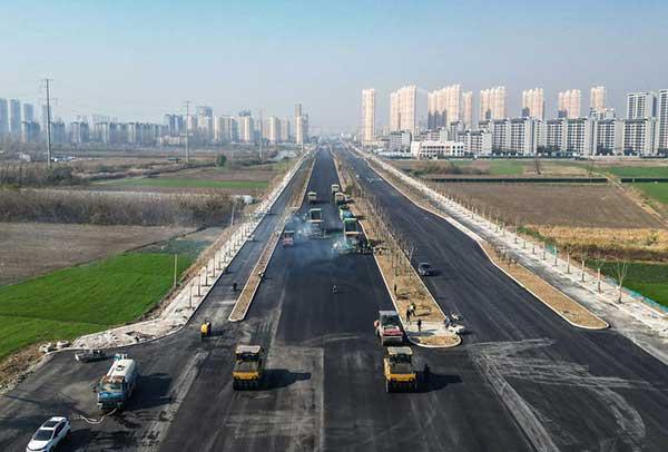 宿城銀河一路東延工程韓池子路以東路段在進行瀝青鋪設作業。