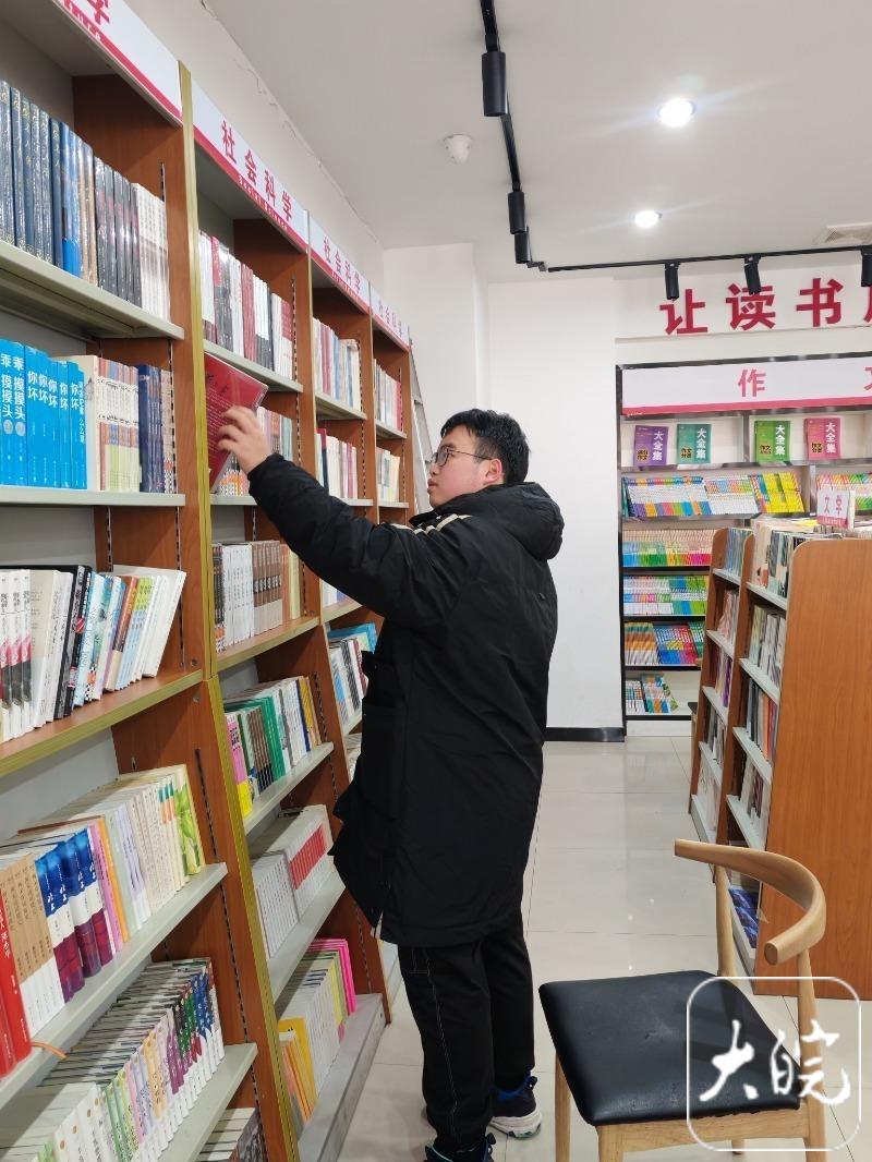 在閱讀區(qū),有一名孩子正埋頭沉浸在書(shū)本間。還有一名在外地上大學(xué)的青年正在書(shū)架前選購(gòu)圖書(shū)。這名青年介紹,他比較喜歡哲學(xué)、歷史、文學(xué)類的書(shū)籍。寒假回家?guī)У囊槐緯?shū)已經(jīng)讀完了,“開(kāi)學(xué)還有幾天,我來(lái)買幾本書(shū)讀。”記者看到,他已經(jīng)選了3本書(shū),目光還在書(shū)架上尋找。
